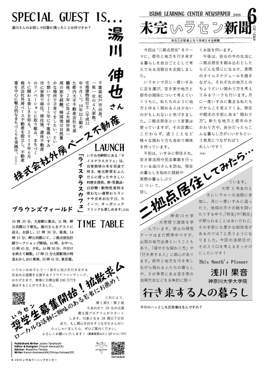 大学3年生のときにいラセンの活動に参加し、月に一度いすみに通ったり、地域の方々の話を聞いたりする中で、「移住」や「観光」が語られることは多いけれど、その手前にも豊かな関係性があるのでは?と思うようになりました。今回の活動日が、その入り口を考えるきっかけにしたいです!