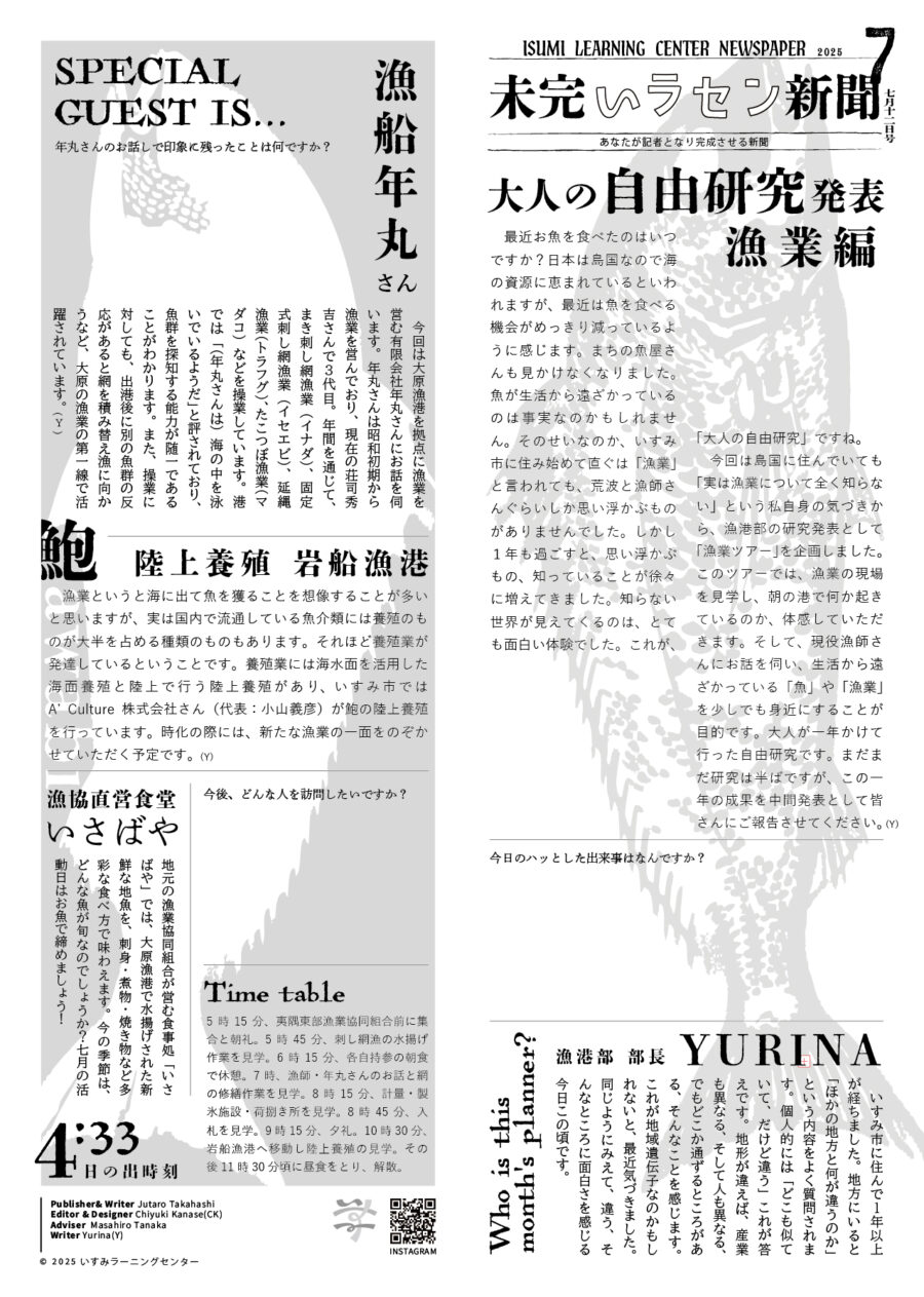 最近お魚を食べたのはいつですか?日本は島国なので海の資源に恵まれているといわれますが、最近は魚を食べる機会がめっきり減っているように感じます。まちの魚屋さんも見かけなくなりました。魚が生活から遠ざかっているのは事実なのかもしれません。そのせいなのか、いすみ市に住み始めて直ぐは「漁業」と言われても、荒波と漁師さんぐらいしか思い浮かぶものがありませんでした。しかし1年も過ごすと、思い浮かぶもの、知っていることが徐々に増えてきました。知らない世界が見えてくるのは、とても面白い体験でした。これが、「大人の自由研究」ですね。