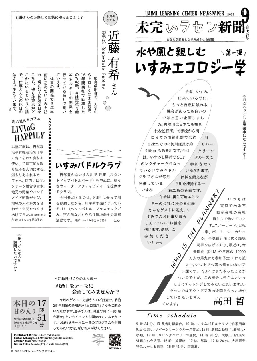 折角、いすみに来ているのに、もっと自然に触れる機会があっても良いのではと思い企画しました。夷隅川は日本でも類まれな蛇行河川で源流から河口までの直線距離では約22kmなのに河川延長は約45kmもある川です。今回は、いすみと勝浦でSUPのレクチャーを行なっているいすみパドルクラブさんが毎月開催しているいすみ川リバークリーンクルーズに参加させていただきます。体幹を鍛えながら川を清掃する一石二鳥の企画です。是非、ご参加ください!