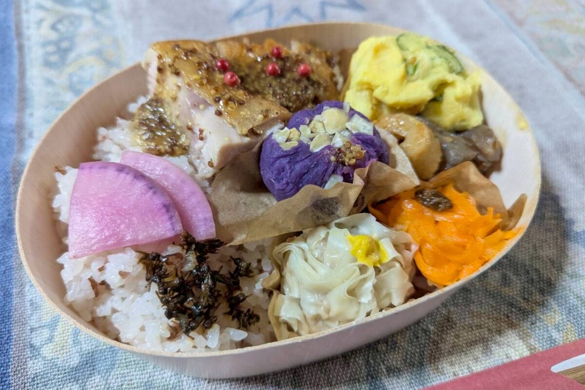 昼食は、すみれ舎のお弁当。おかずはもちろん、個人的には神丹穂入りのごはんが甘みがあってとても美味しかった。さらに、コモジーハウス店主の添さんが用意してくださった京都の飴屋さんの飴や、ご自身で漬けられたというお漬物もいただいた。